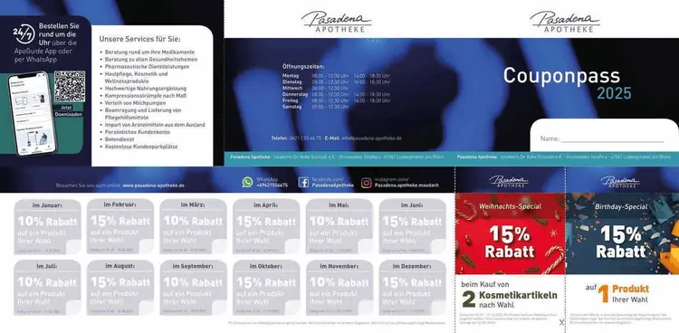 Sicher haben Sie schon darauf gewartet: Hier ist er, unser neue Couponpass für 2025 mit den attraktiven Monatsrabatten für das ganze nächste Jahr. Kommen Sie am besten gleich zu uns in die Apotheke und sichern sich Ihr persönliches Exemplar!